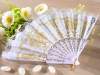 Folding fans suitable for wedding favors in plastic and white fabric with gold tree of life decorations