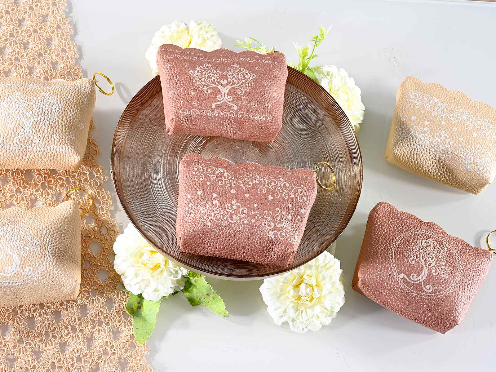 Faux leather coin purse with tree of life decoration, zip and key ring