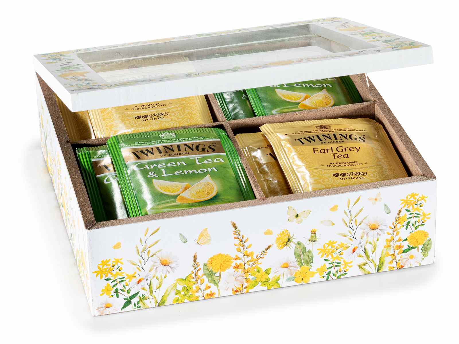 Tea/spice box, wood, glass, 4 compartments, floral print