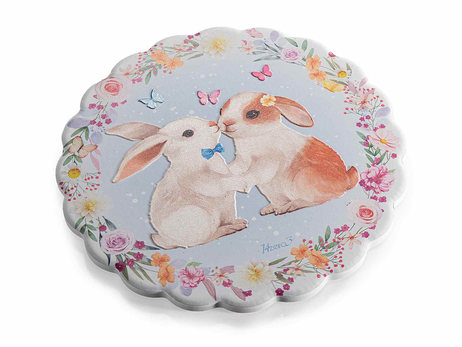 Matte ceramic Easter trivet with cork base and Easter bunny print, in a box.