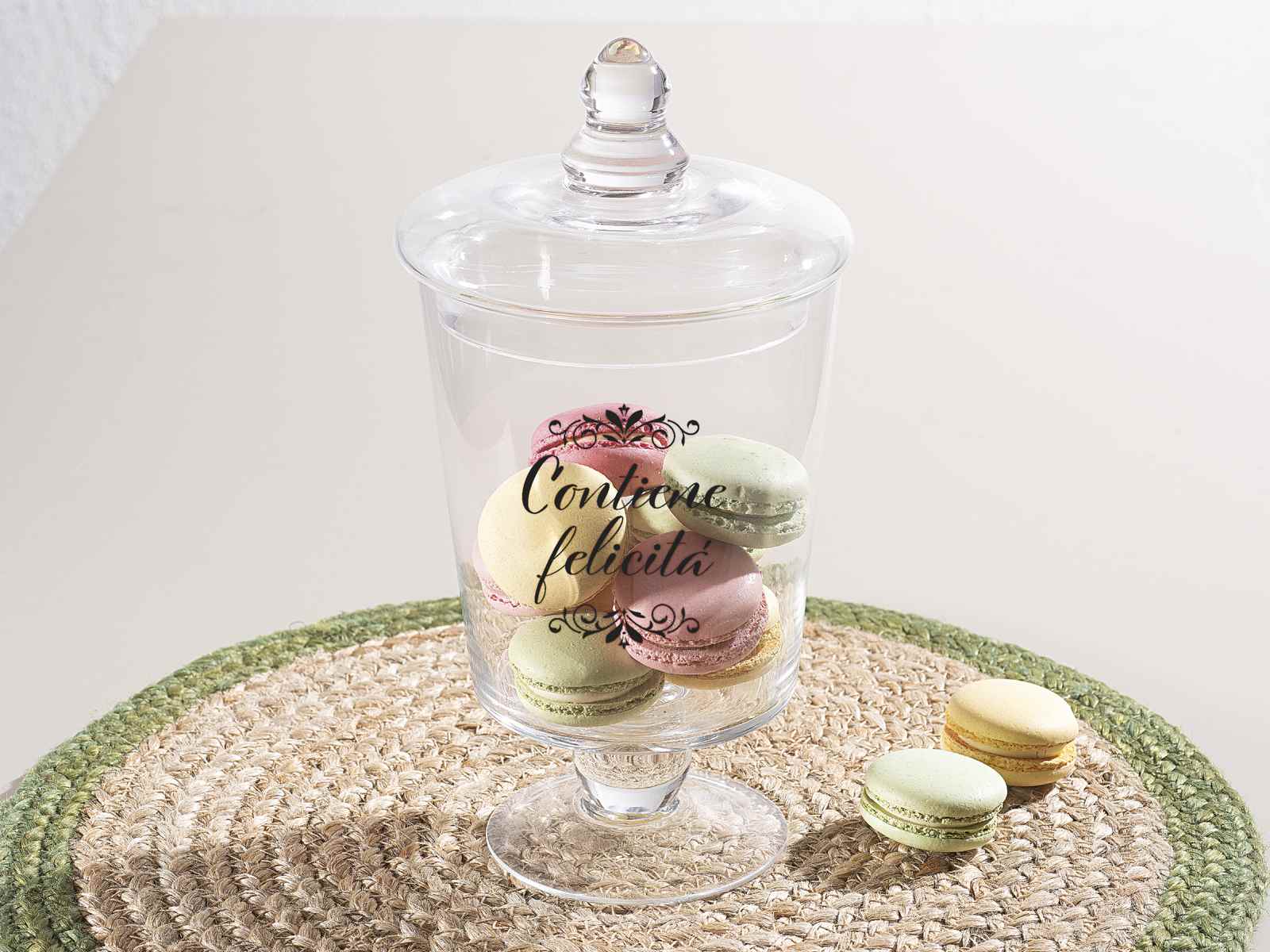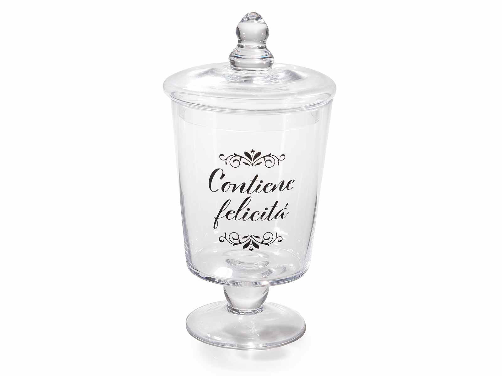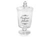 Clear glass food container jars with lid and Contains Happiness writing, ideal for storing sweets, biscuits or candies.