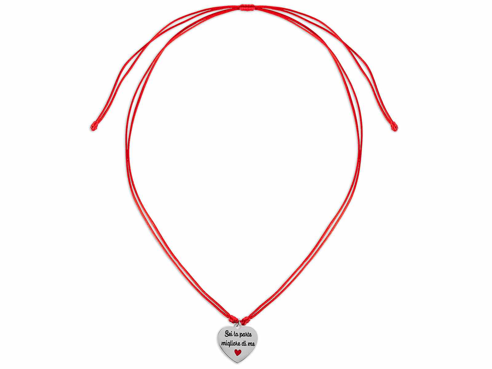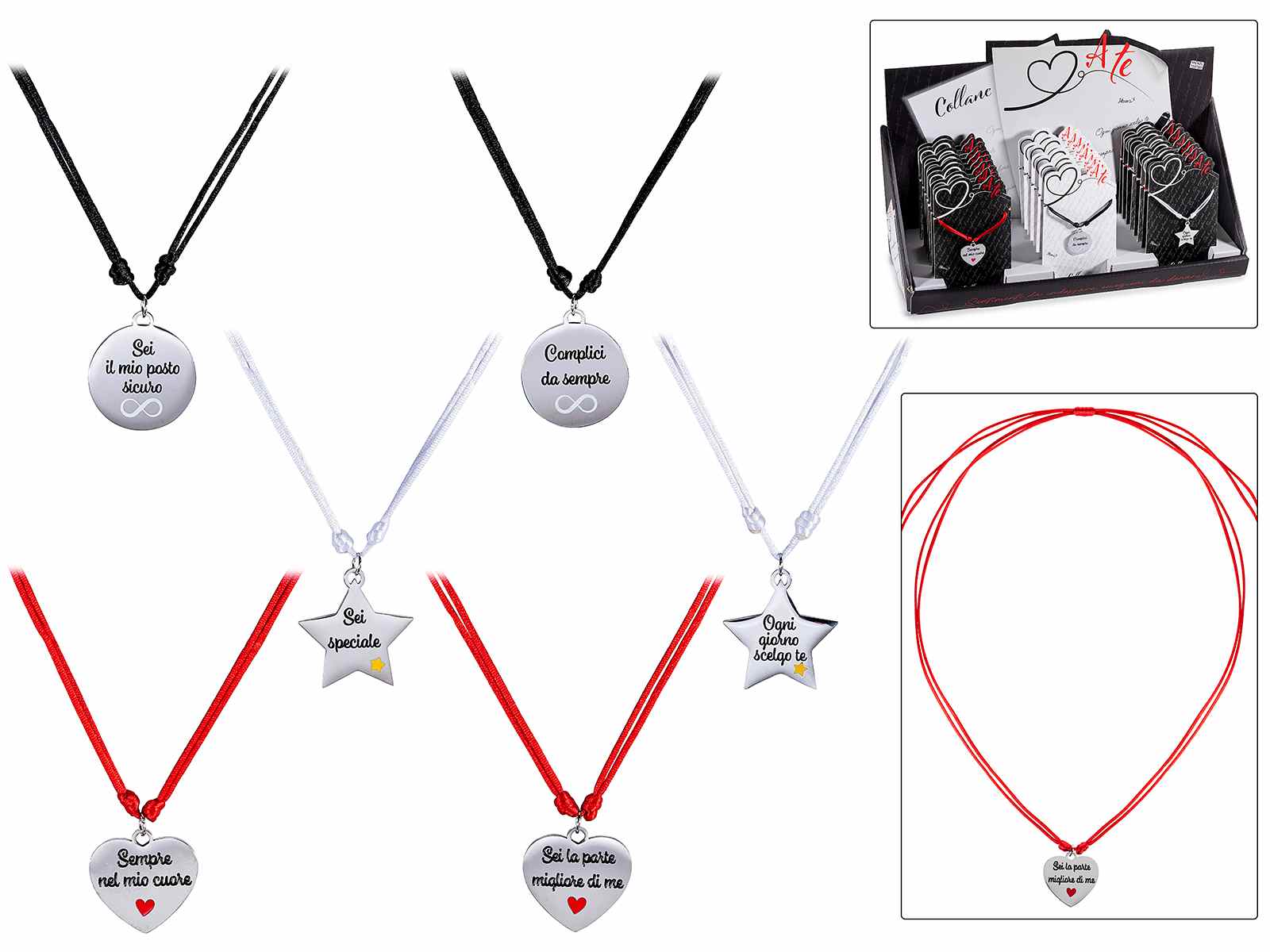 Rope necklaces and metal charms engraved with dedication phrases and enamel, in a 24-piece display