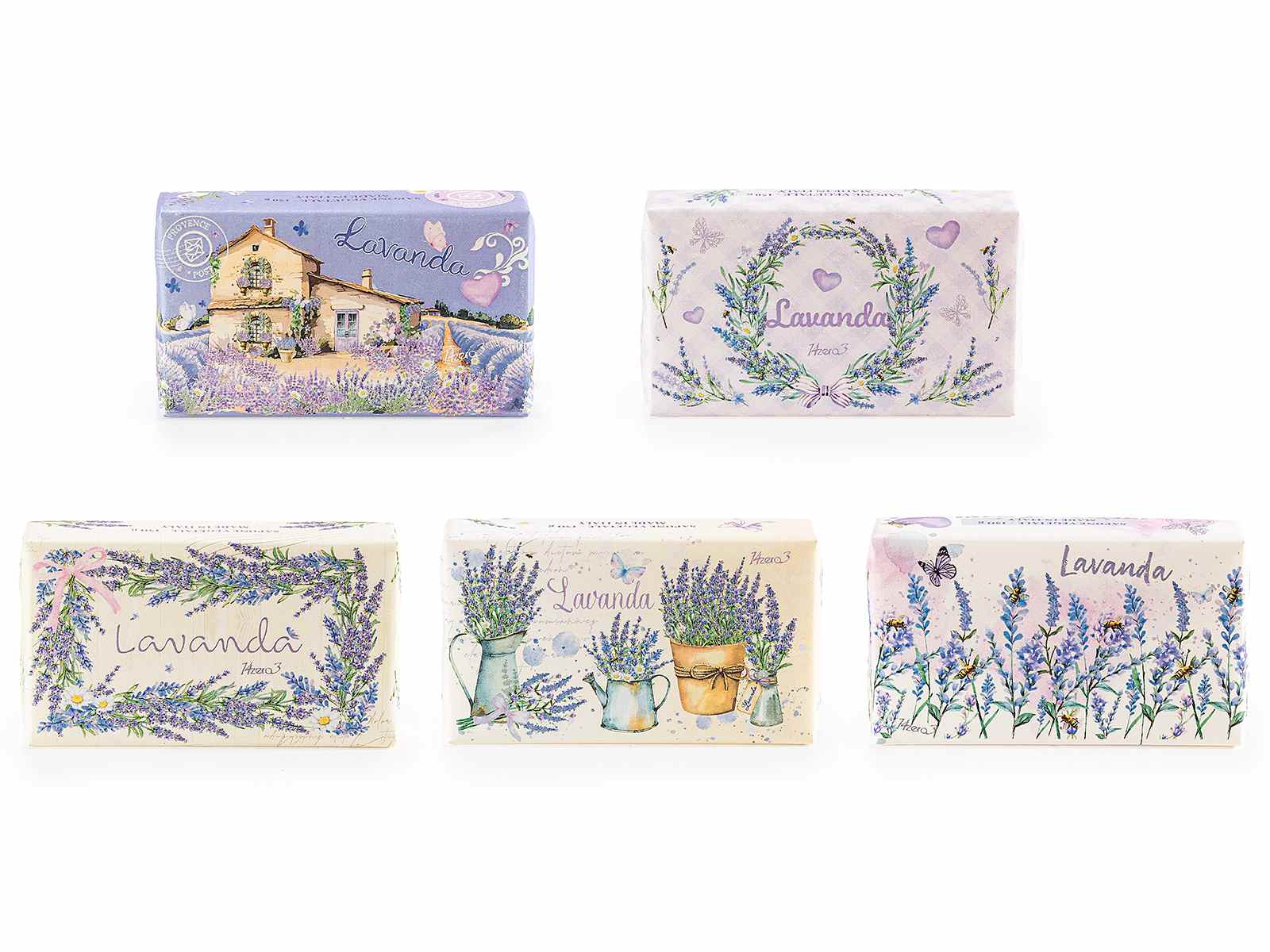 Scented vegetable soaps with lavender print, without dyes and made in Italy, in a display of 30 pieces