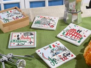 Italy Ceramic Souvenir Coasters Stacked in Wooden Box of 4 Sottobicchiere: 10 x 10 H.