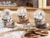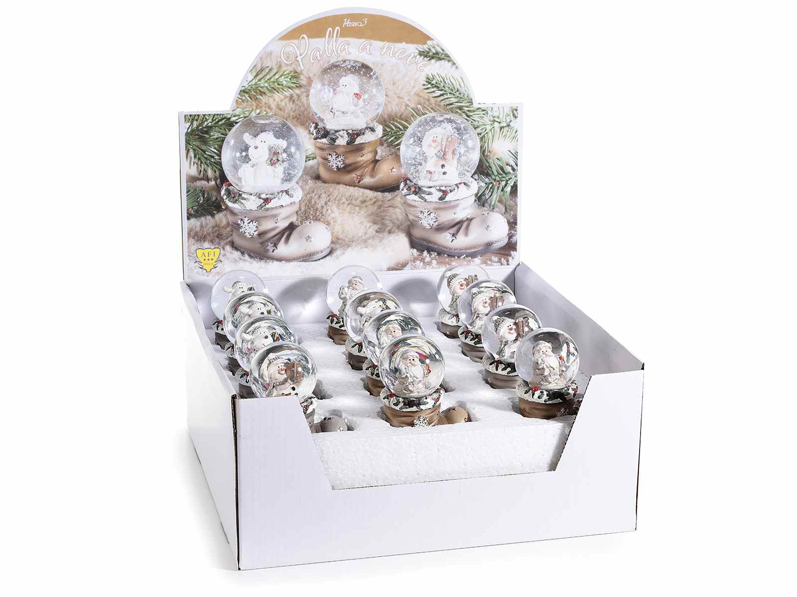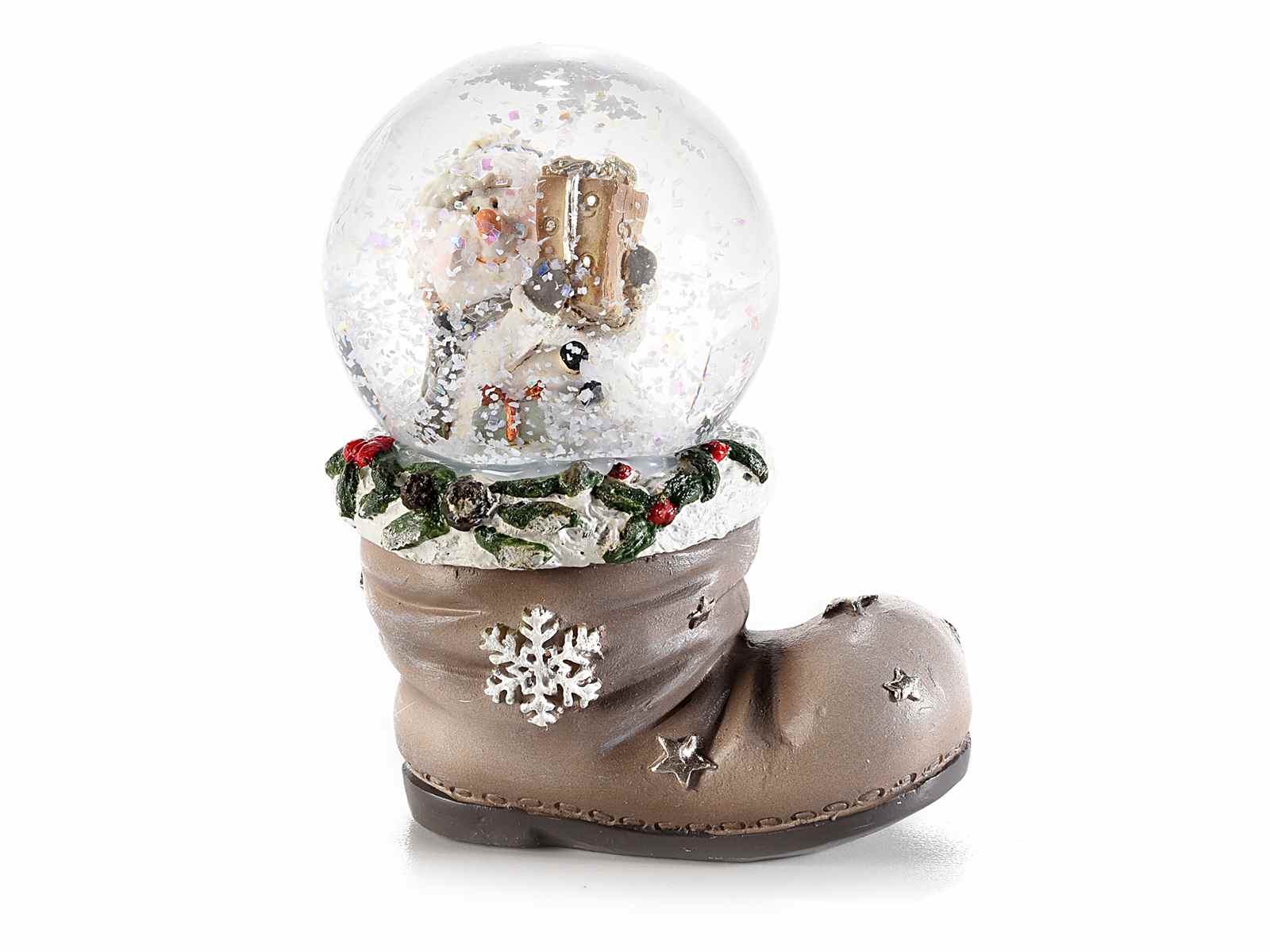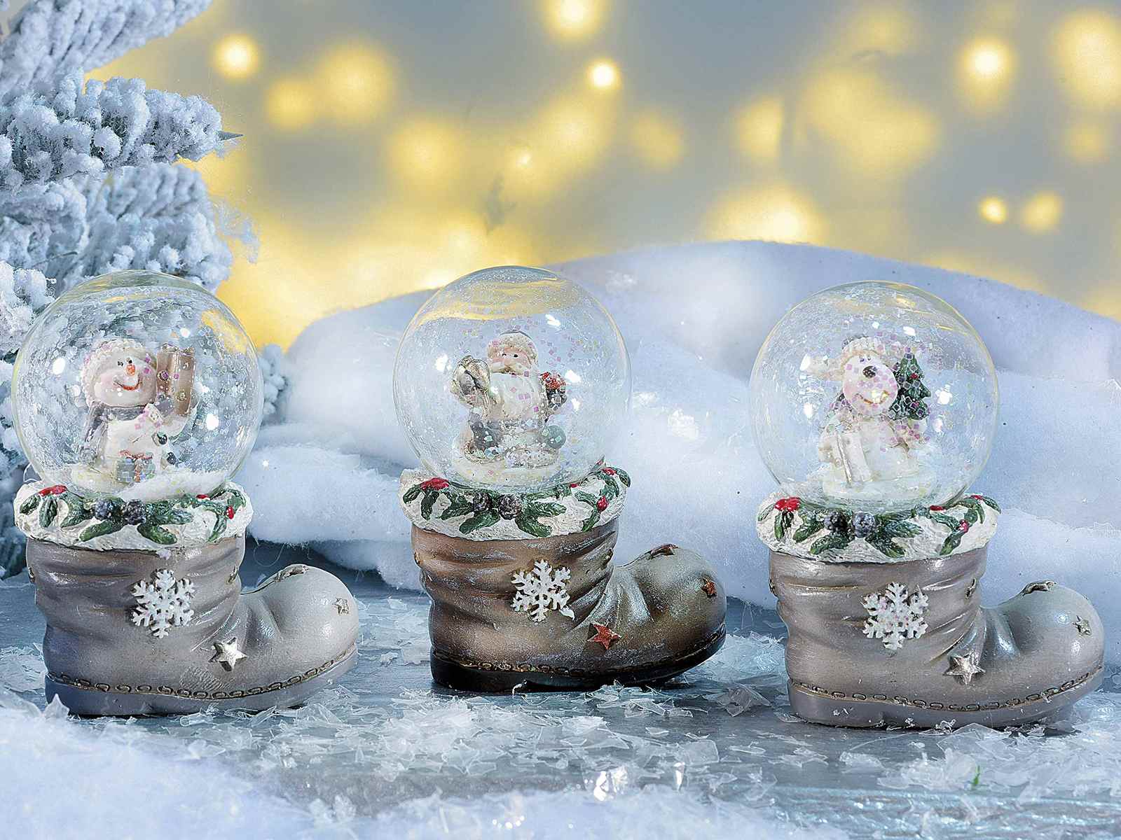 12-piece resin Christmas snow globe display featuring a Christmas character on a boot.