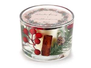 Scented Christmas candles in glass jar with holly decorations, gift box with gold bow and greetings Ø 7,5 cm x 8 H. Fragranze: Apple Cinnamon Cloves, Patchouli, Sandalwood, Amber Tea - Durata: 20 h