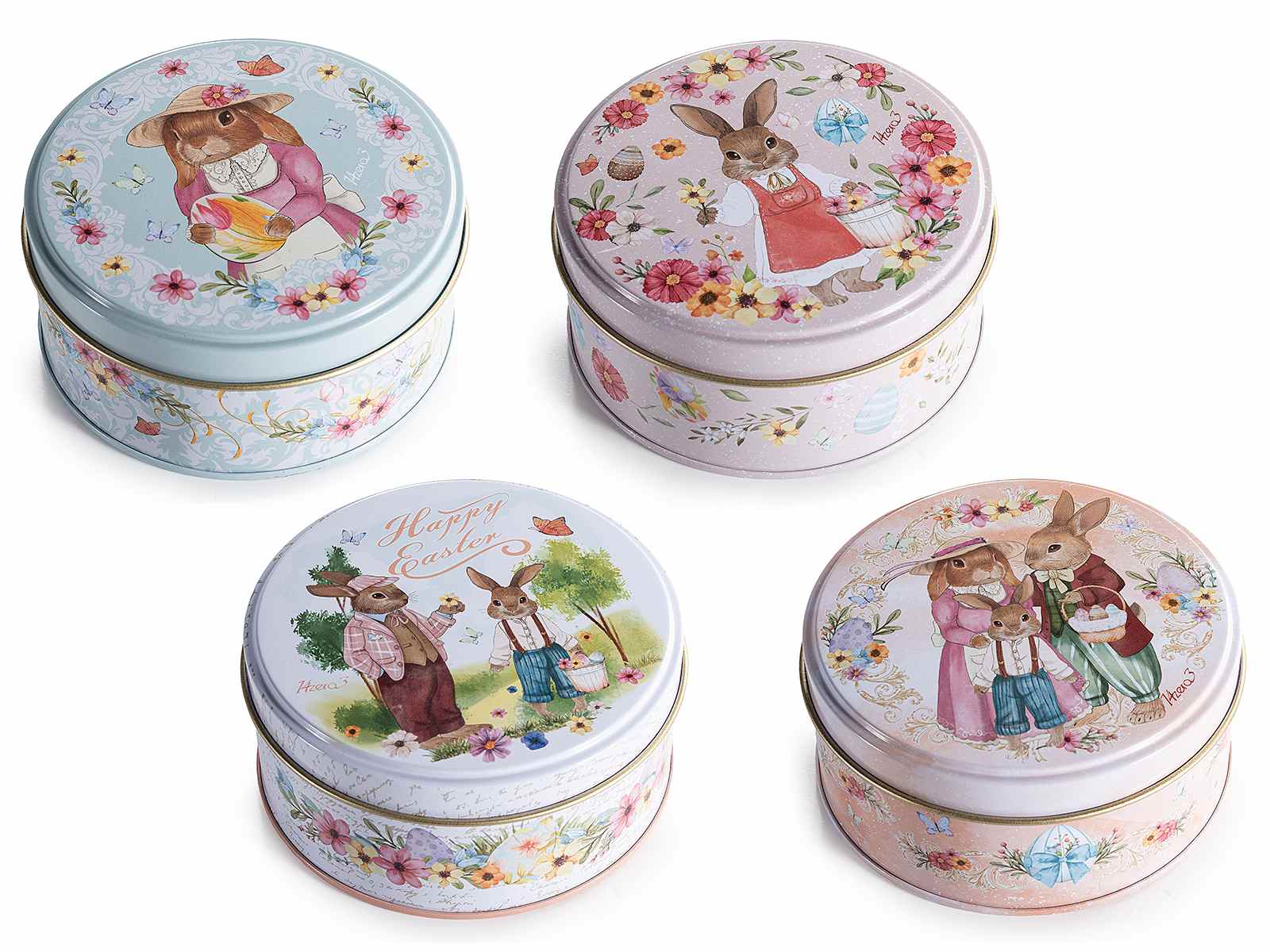 Round metal boxes with Easter bunny prints, ideal for wrapping Easter-themed gifts and souvenirs.