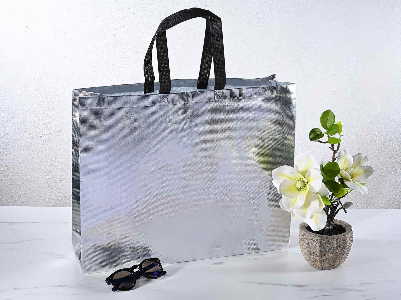Reusable maxi bags / shoppers in silver metallic non-woven fabric