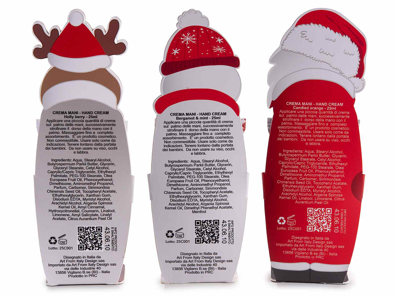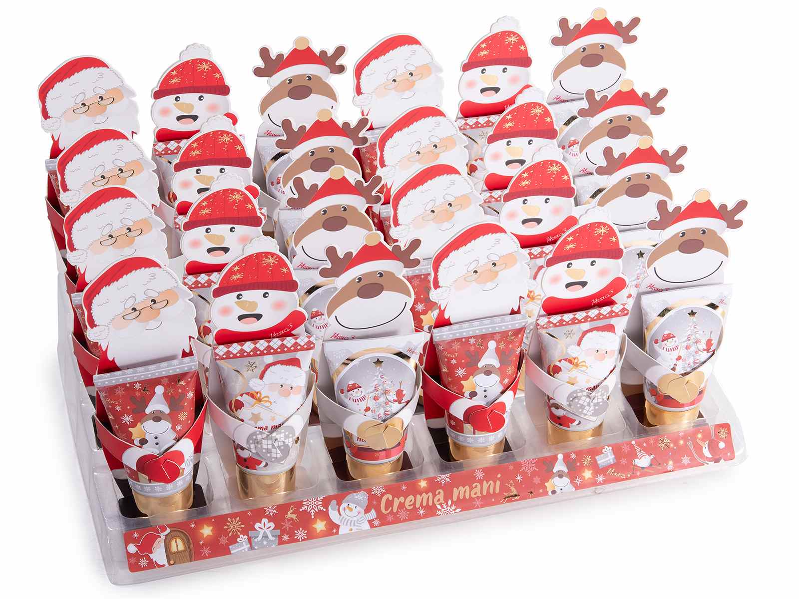 25 ml scented Christmas hand cream in a gift box shaped like Santa Claus, reindeer, and snowman. Display of 24 pieces.