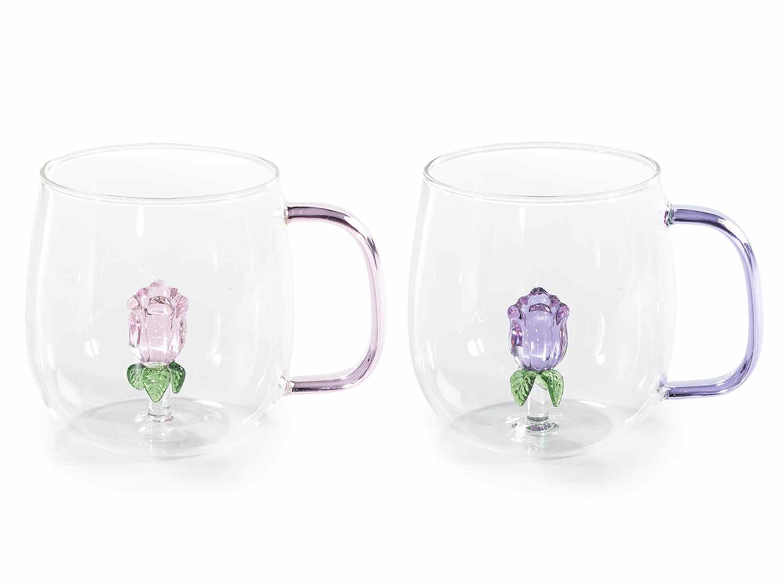 Clear glass mugs with 3D rose and colored handle