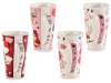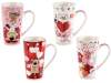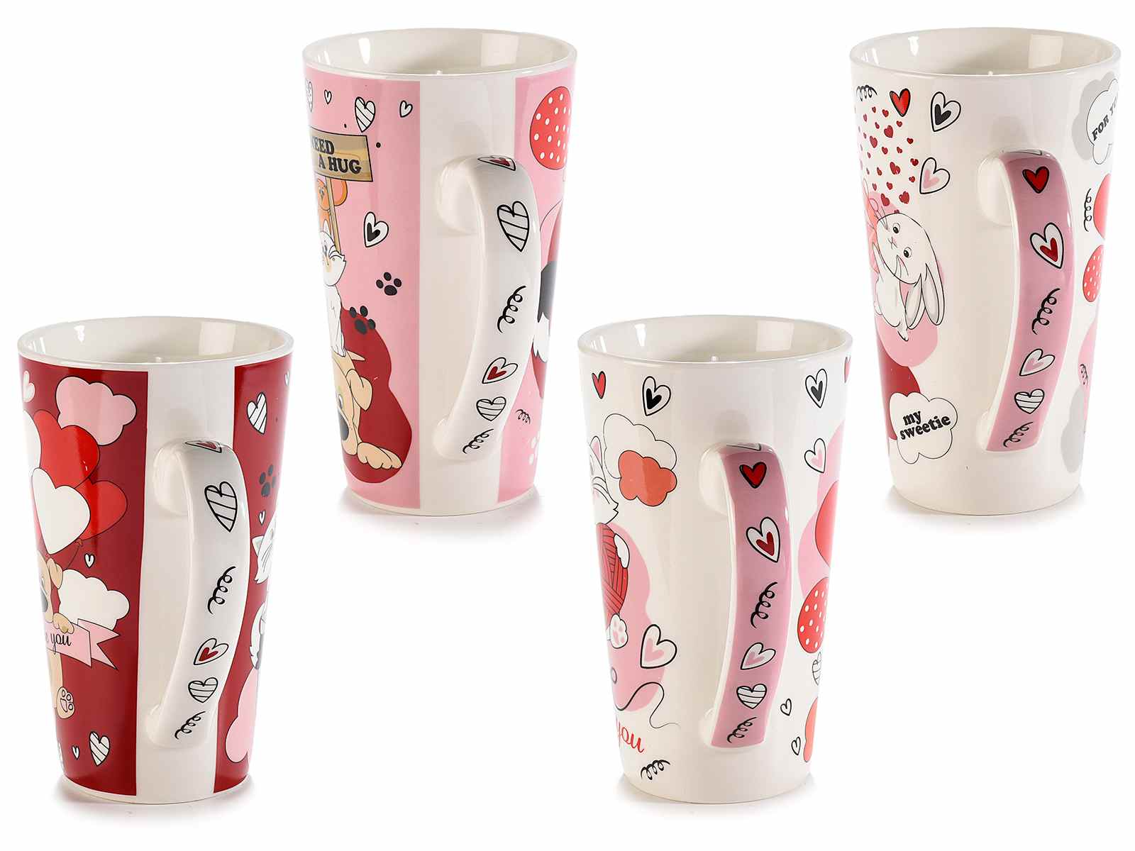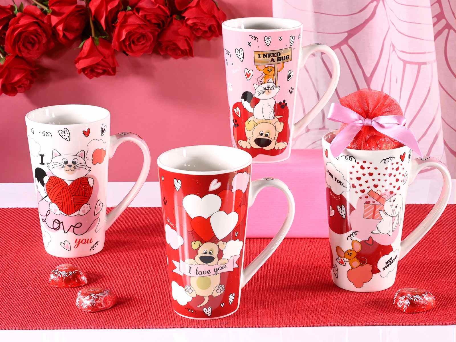 Porcelain mugs with dog, cat, and heart prints, perfect for Valentine's Day.