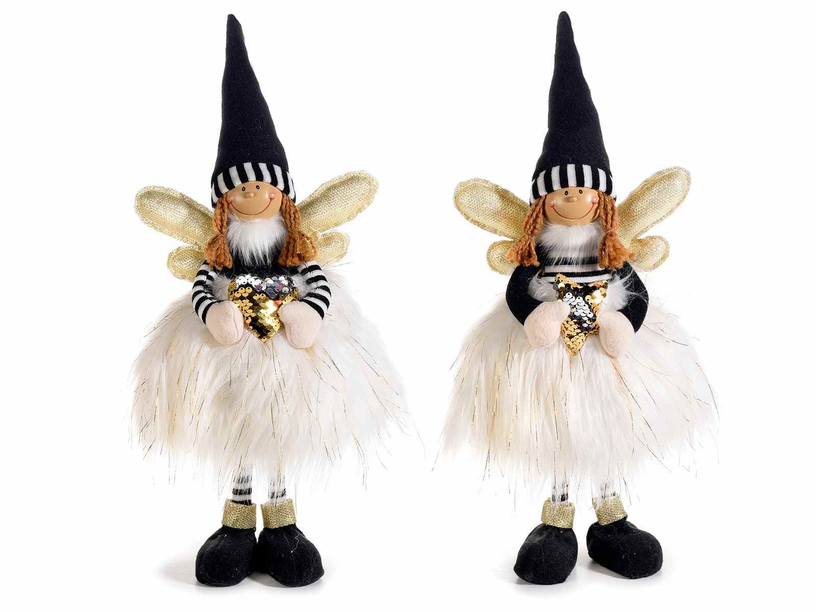 Christmas angels with gold thread faux fur dress, sequin heart and gold glitter wings