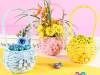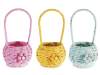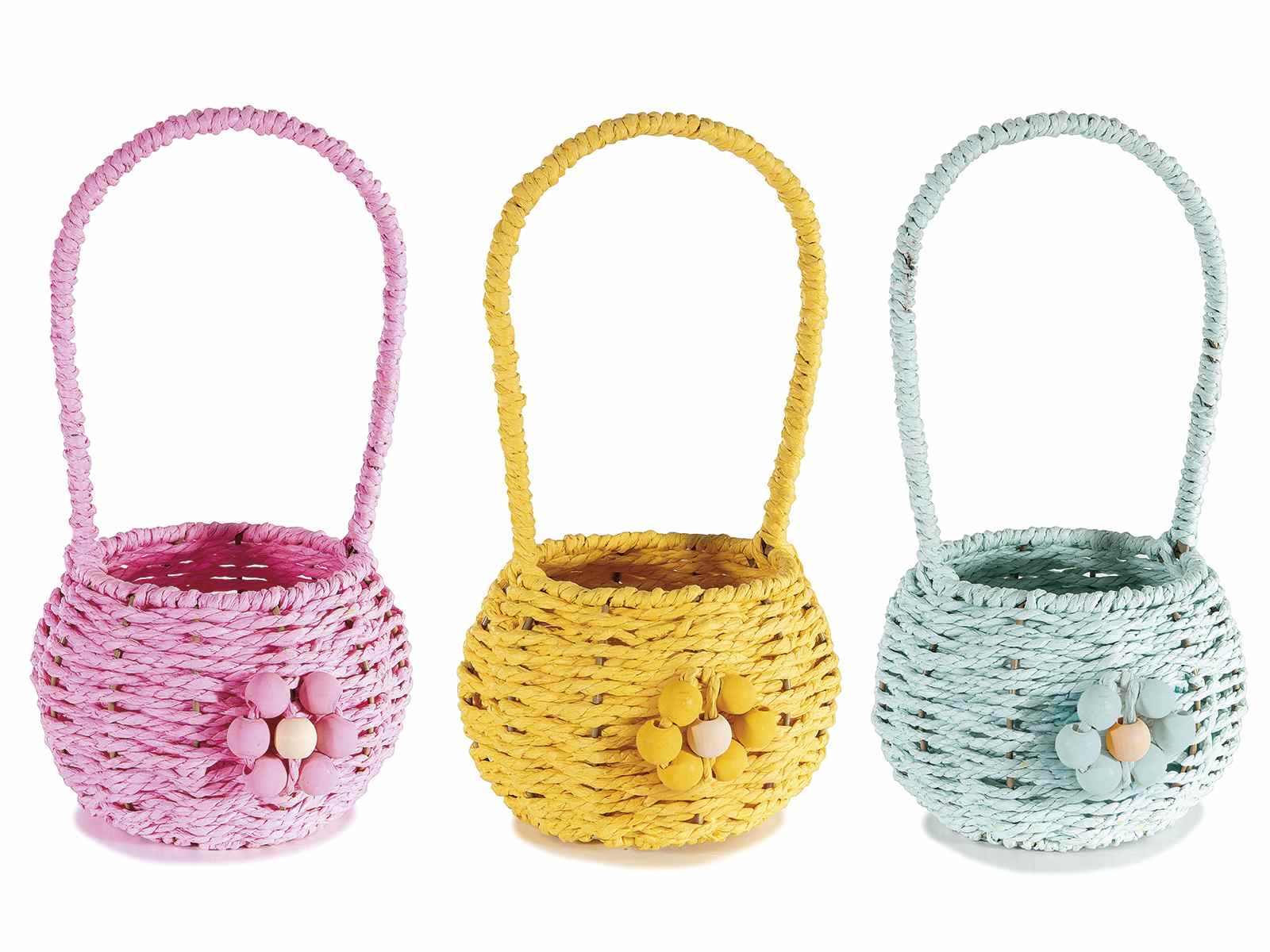 Pink, blue and yellow colored baskets with woven paper handle and decorative wooden flower