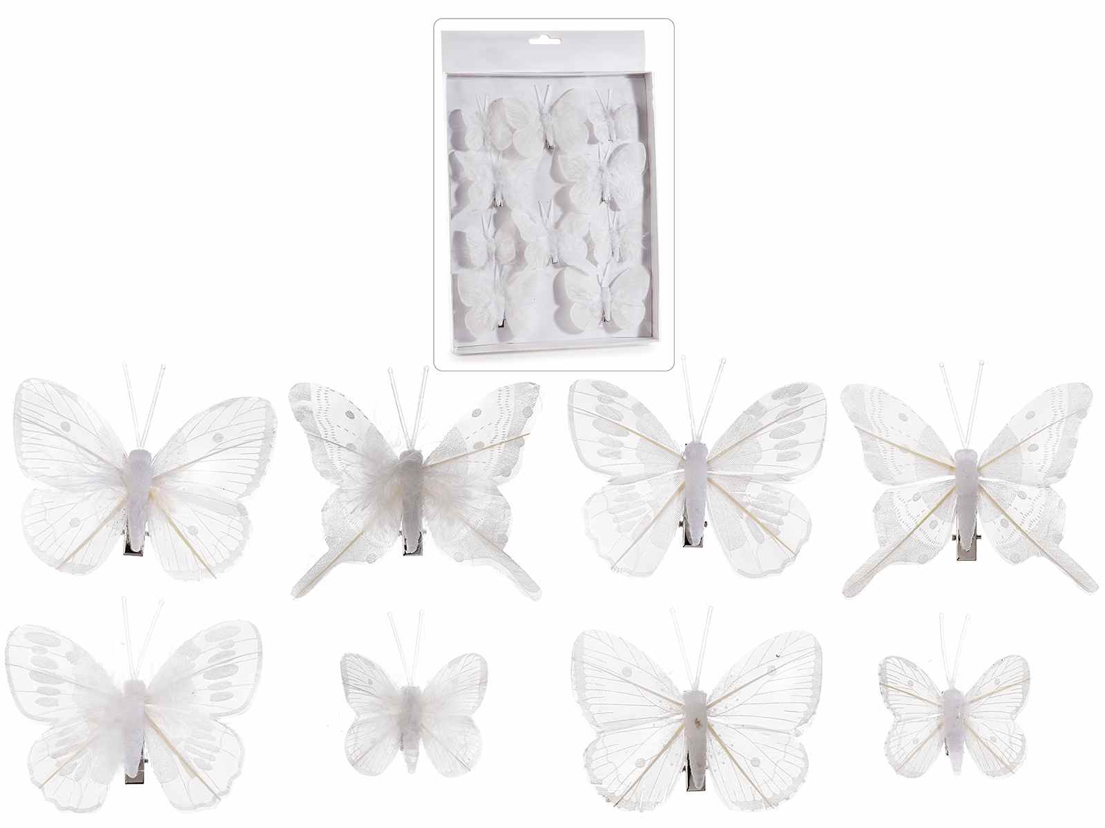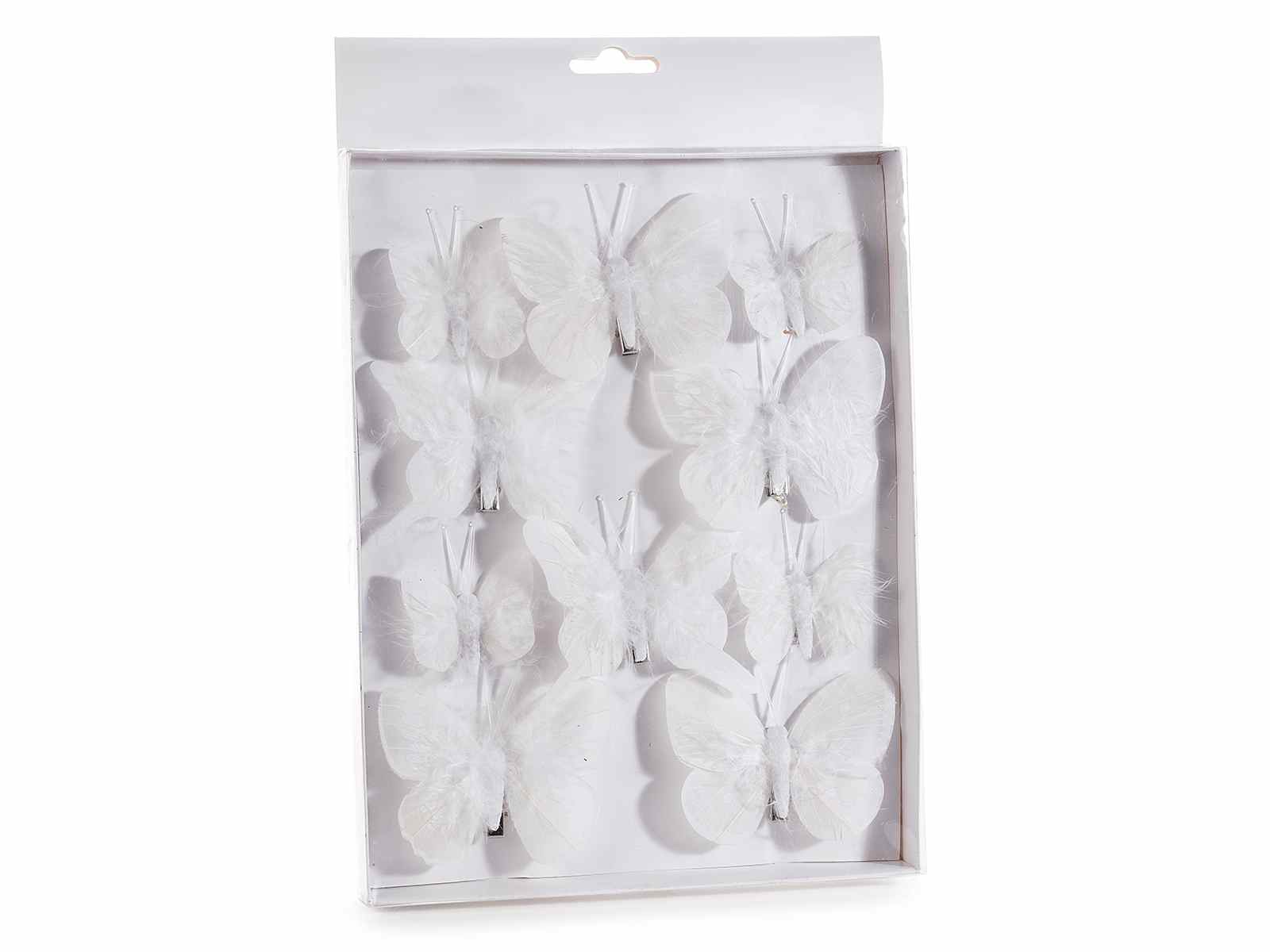 Decorative white butterflies with feathers and assorted clips in 2 sizes in a box of 10 pieces
