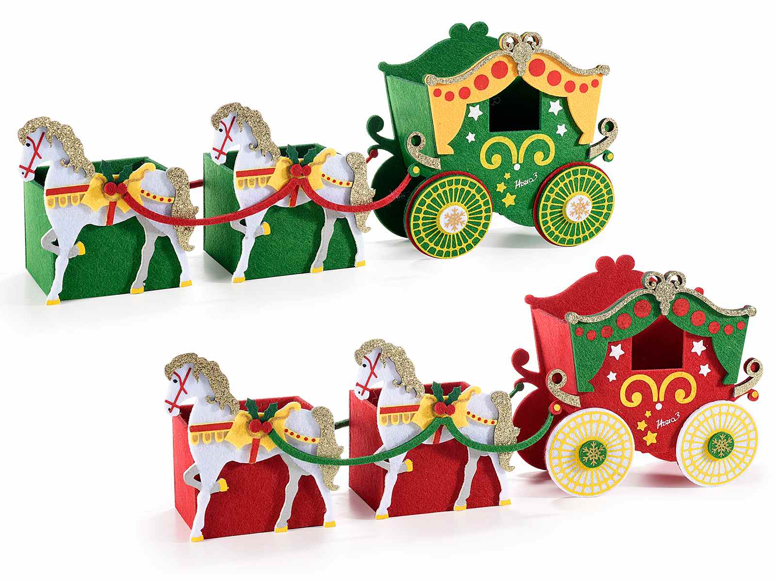 Christmas cloth sweet holder in the shape of a carriage with horses and embossed decorations