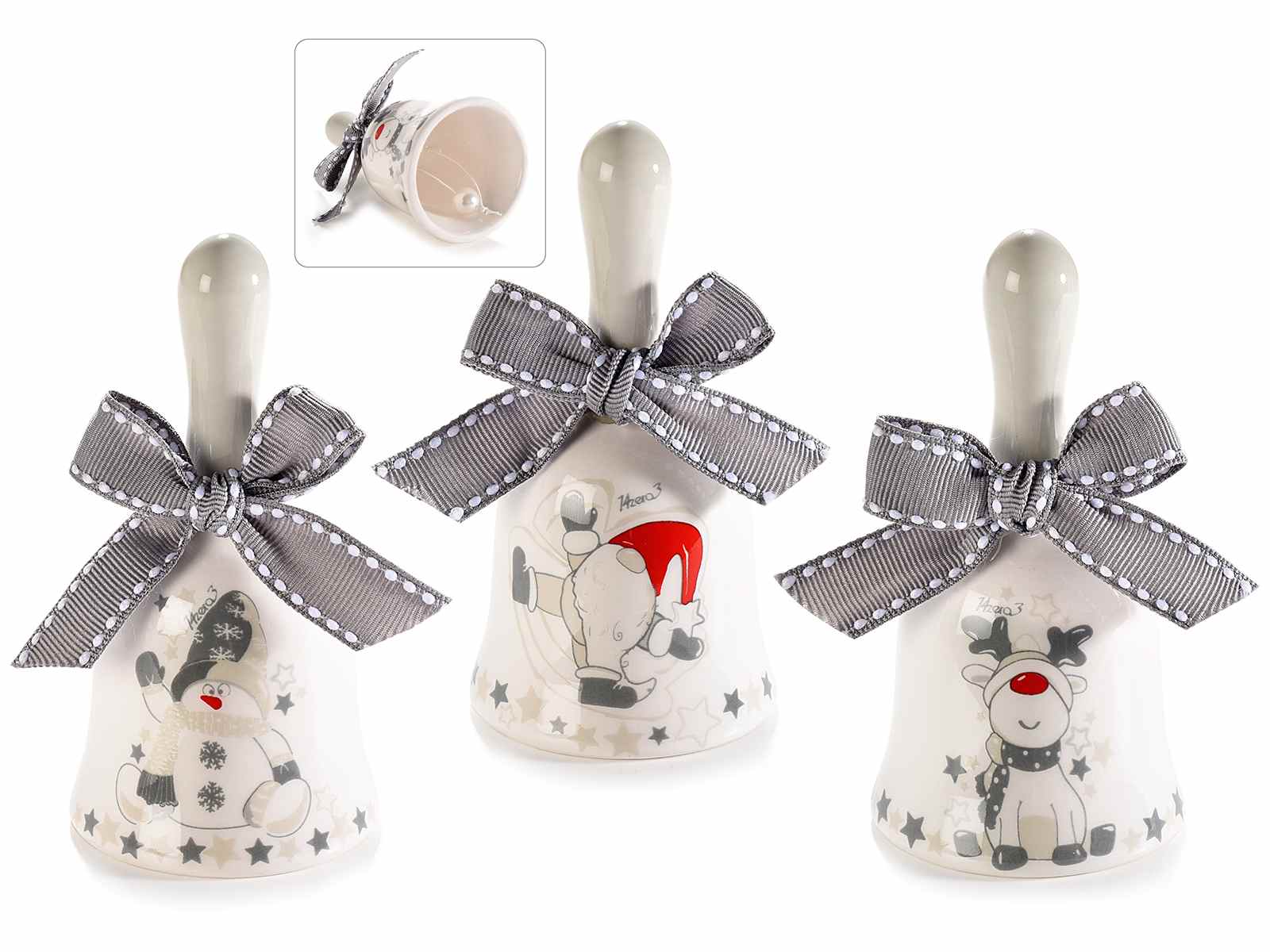 Ceramic bells decorated with reindeer, Santa Claus and snowman with bow
