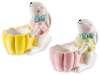 Colorful ceramic Easter egg holders suitable for food contact, featuring a dreamy bunny wearing a colorful polka dot shirt and a decorative bow.