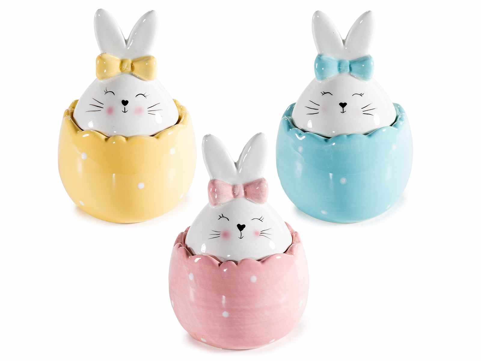 Food-safe, colorful ceramic egg-shaped jars/biscuit jars/cake containers with bunny-shaped lids and bows