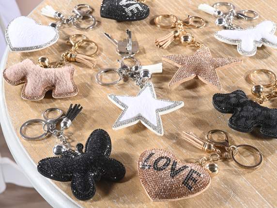 Star, dog, heart and butterfly shaped keychain / bag charm with rhinestones, decorative ball and tassel