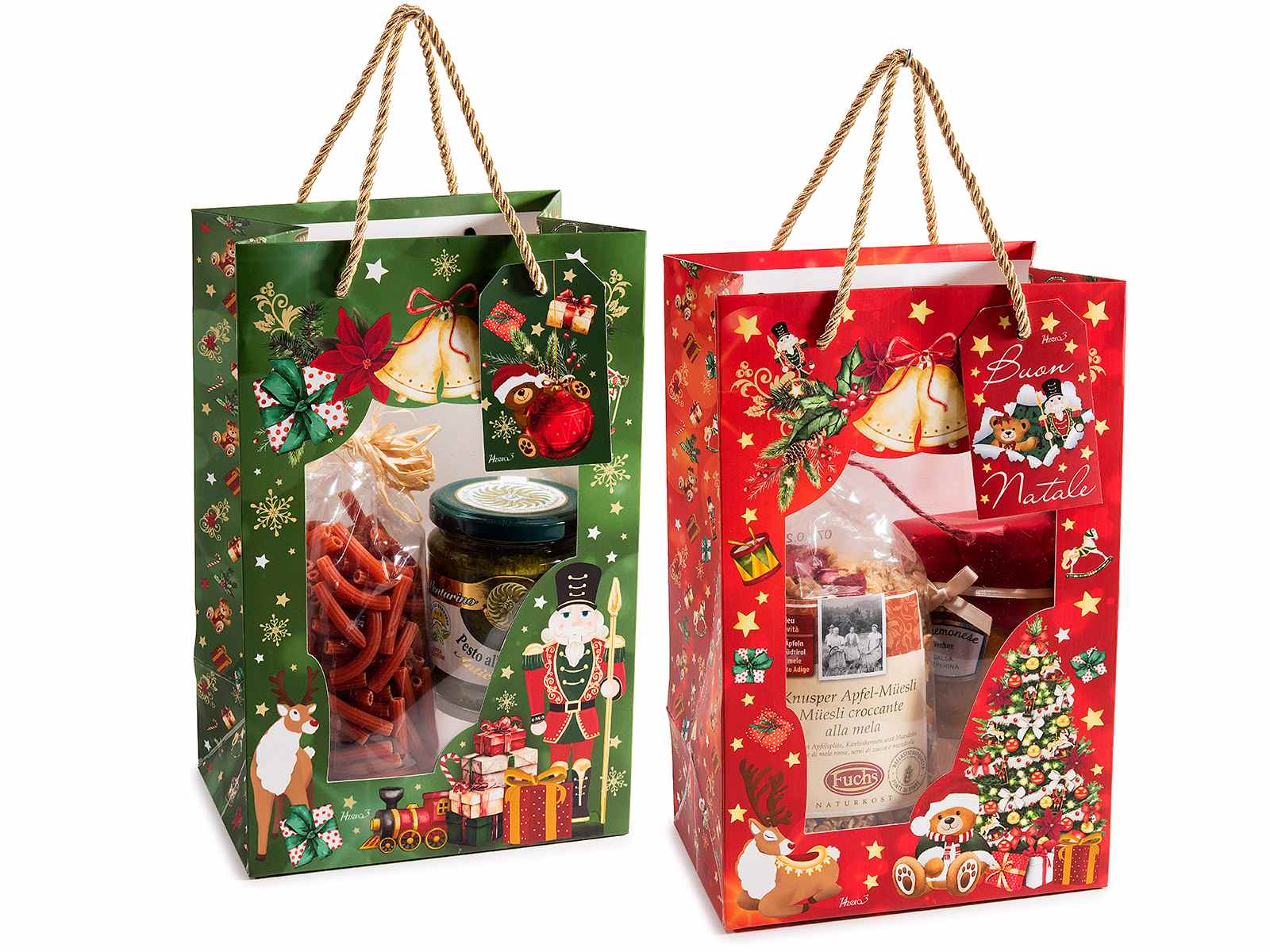 Christmas paper bags/envelopes/shopping bags with a transparent window and a Christmas print featuring nutcrackers and teddy bears, along with a matching card. Ideal for presenting Christmas gifts and wrapping Christmas treats.