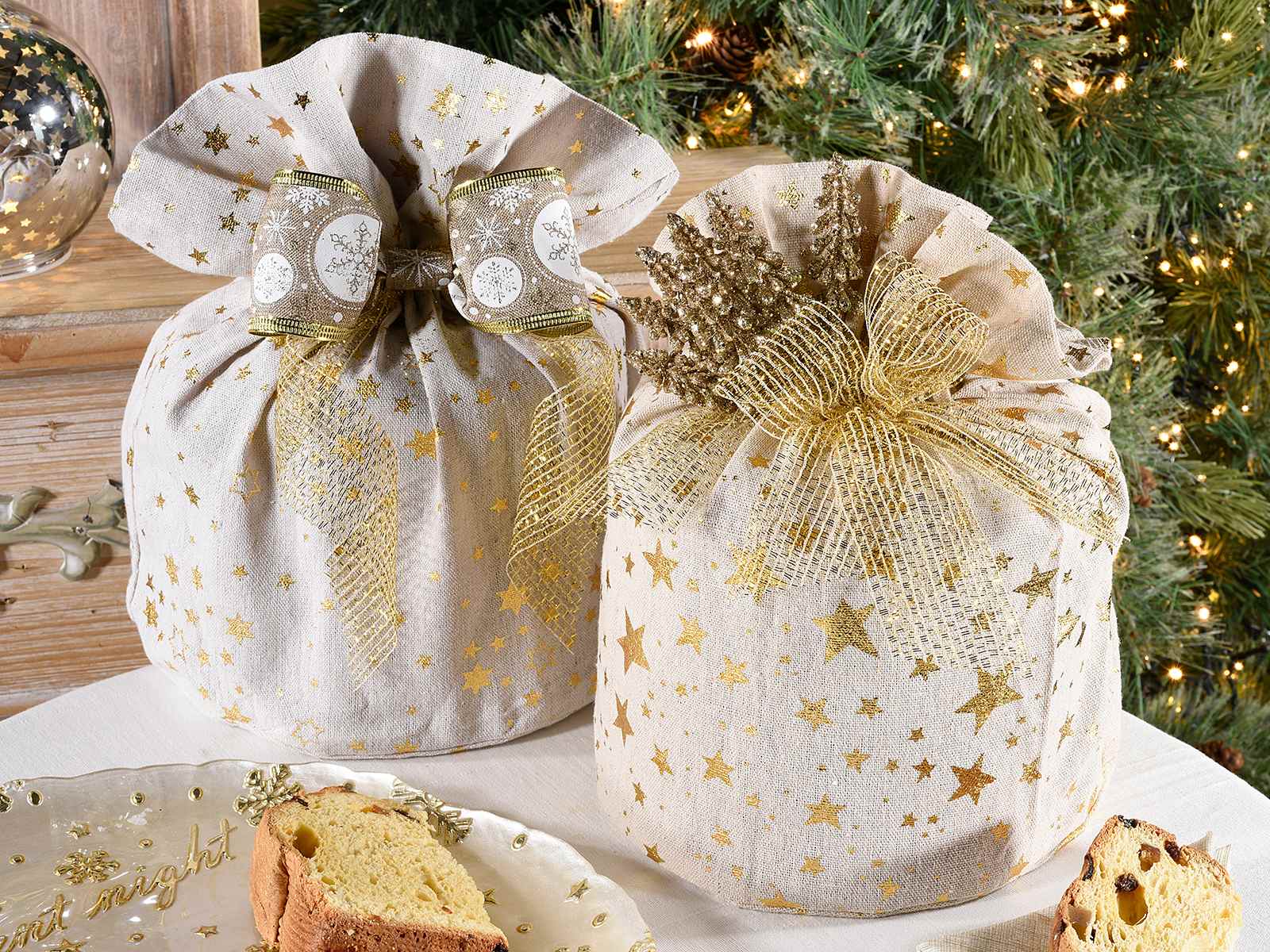 Cloth Panettone Bags with Gold Star Print
