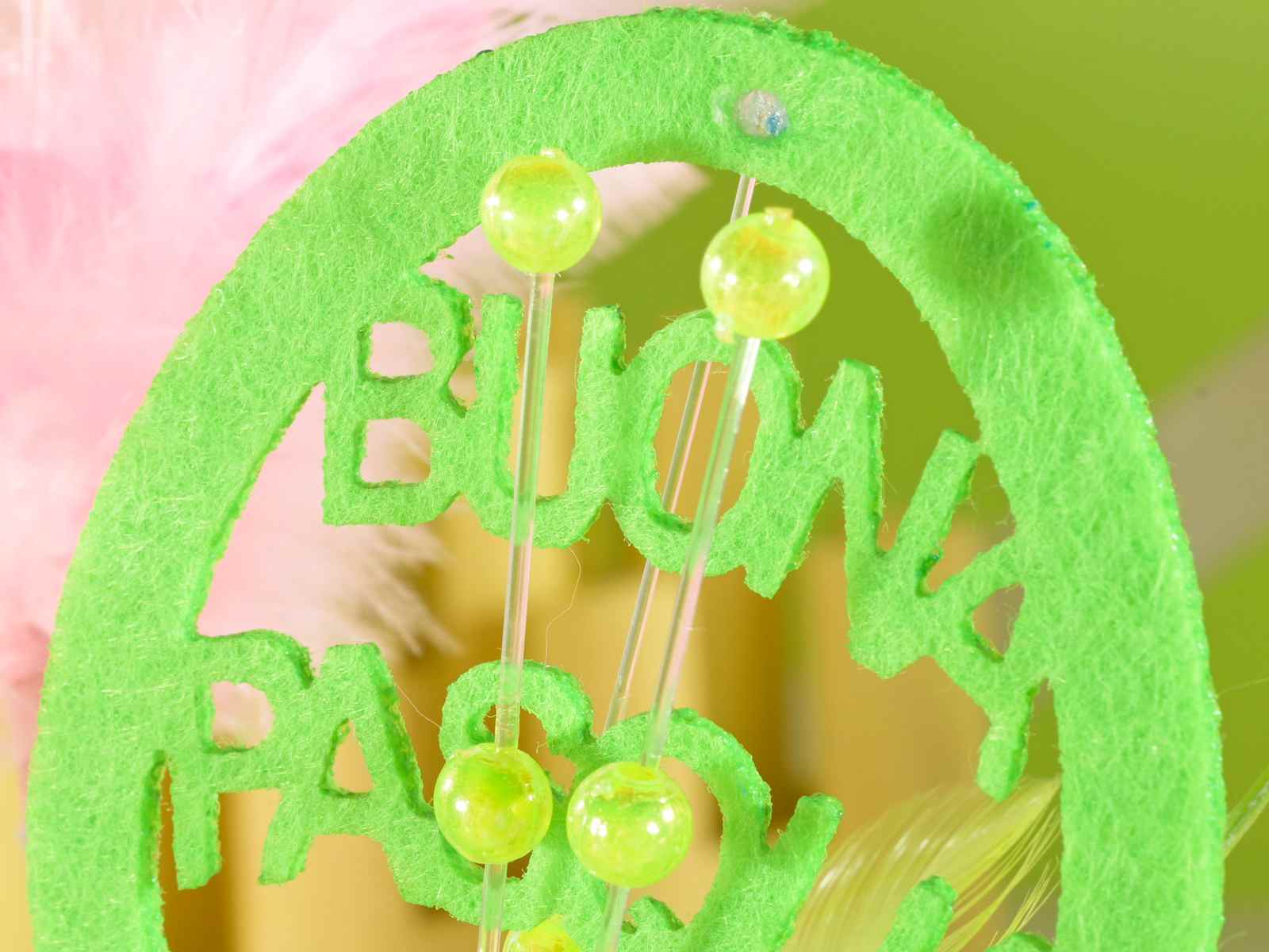Colorful Easter decorative sticks in the shape of a cloth egg with the words Happy Easter, feathers and beads