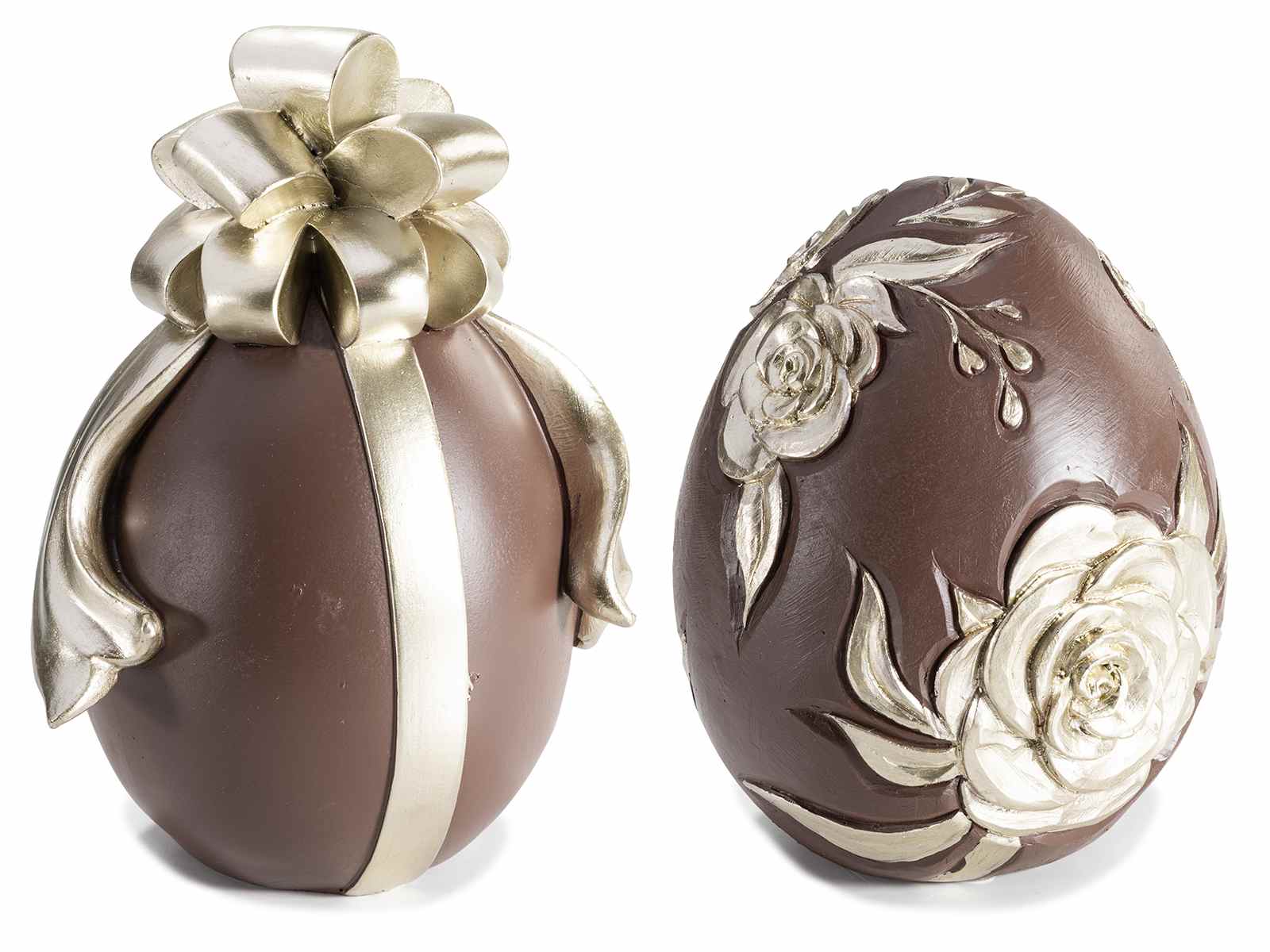 Easter egg in colored resin with a chocolate effect and golden details, bows and embossed flowers.
