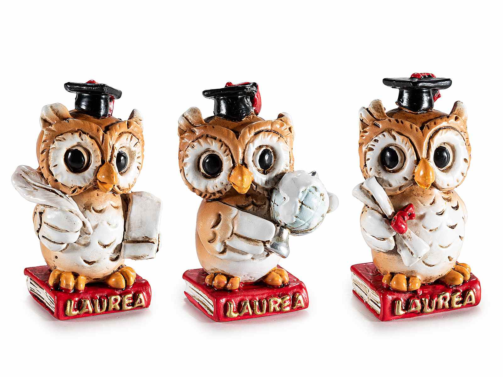 Owls for party favors in colored resin with the word "Graduation" and decorations