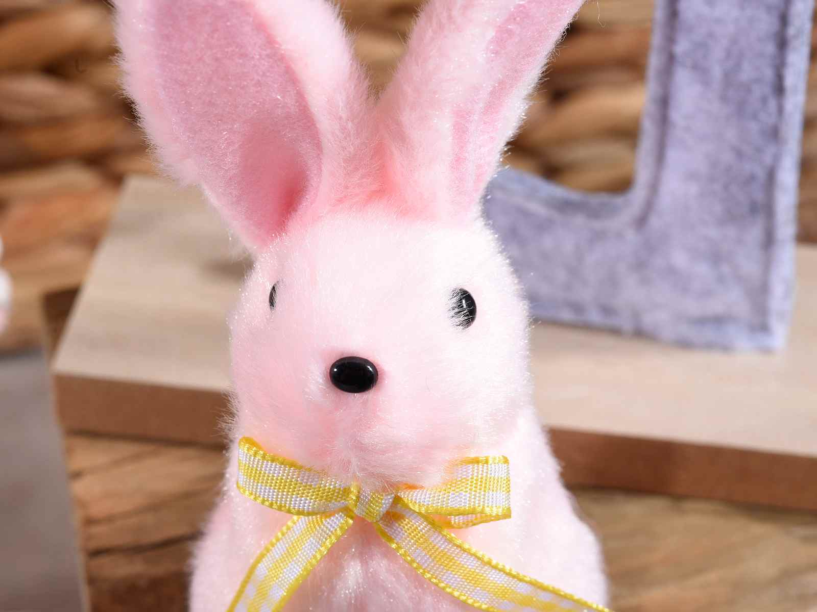 Decorative Easter bunnies made of soft colored artificial fur with extended ears and decorative bow