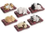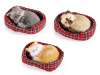 Decorative faux fur kittens asleep in a tartan dog bed