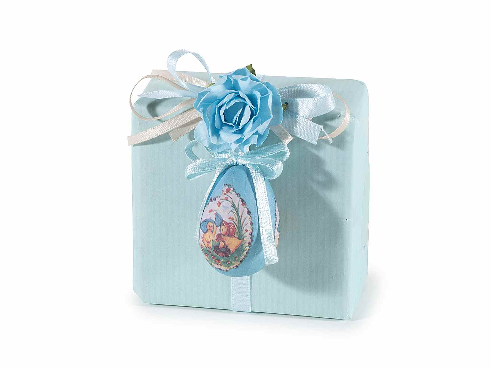Easter eggs covered in paper with Easter prints and a hanging bow