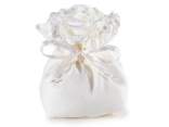 Ecru fabric favor bags with lace trim, rose and drawstring