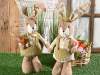 A pair of fabric bunnies with overalls and a sprig, ideal for Easter shop windows.