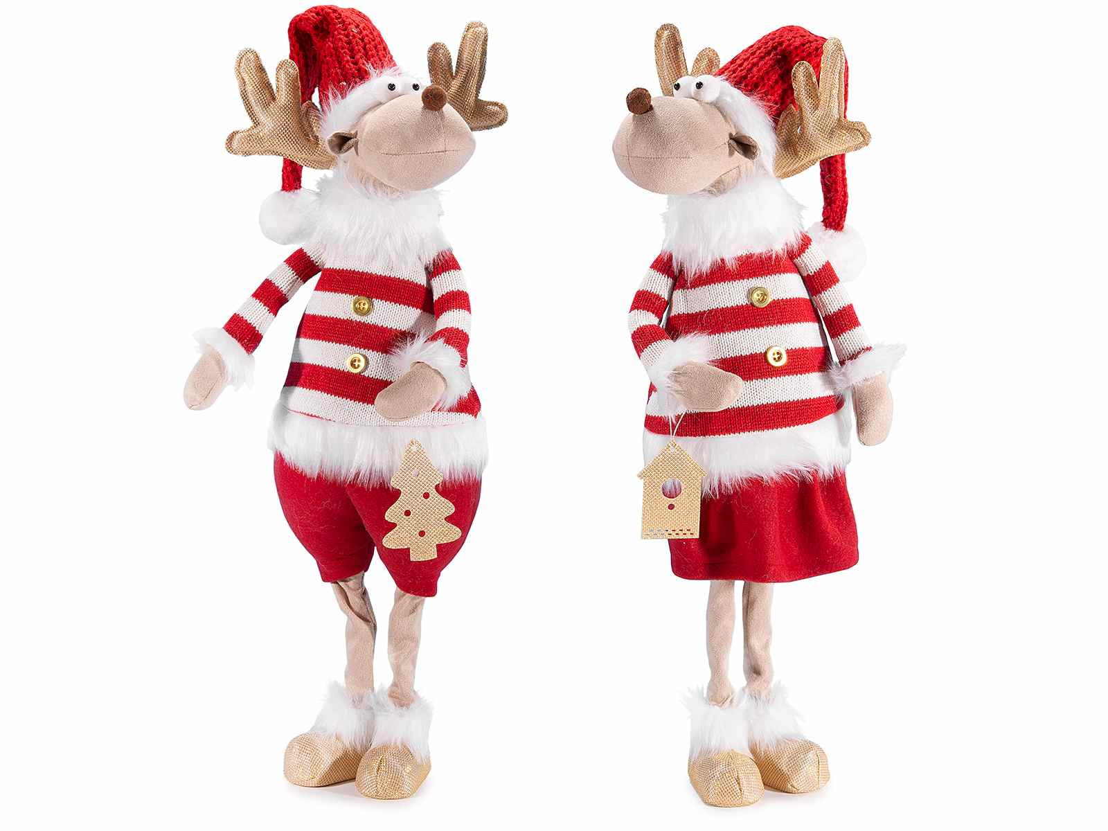 Decorative fabric reindeer with gold details, pendant and clothes with faux fur. Ideal decorations for Christmas shop windows, scenic Christmas arrangements and themed scenography.