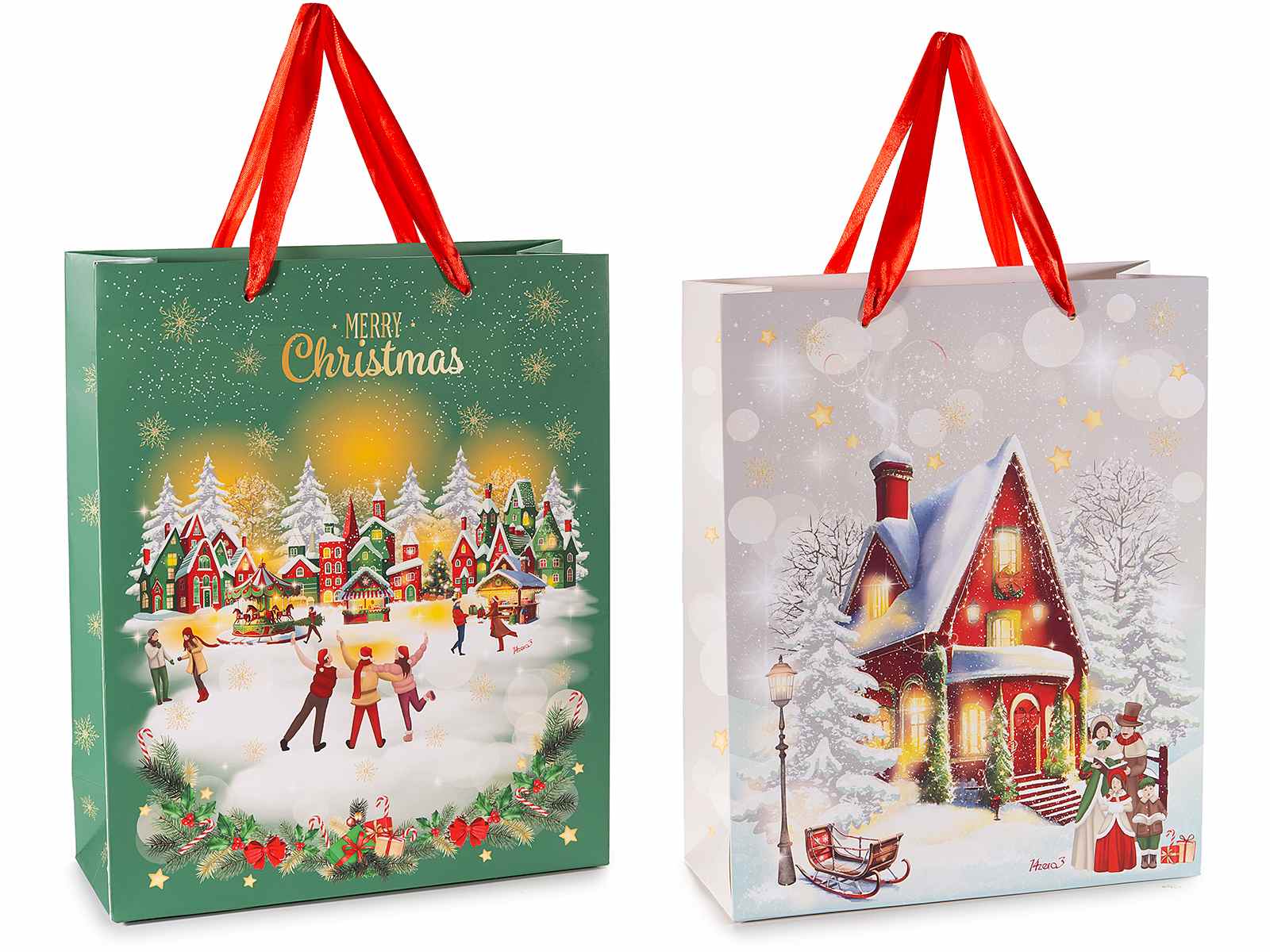 Large sized Christmas village print colored paper bags/shoppers/envelopes