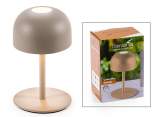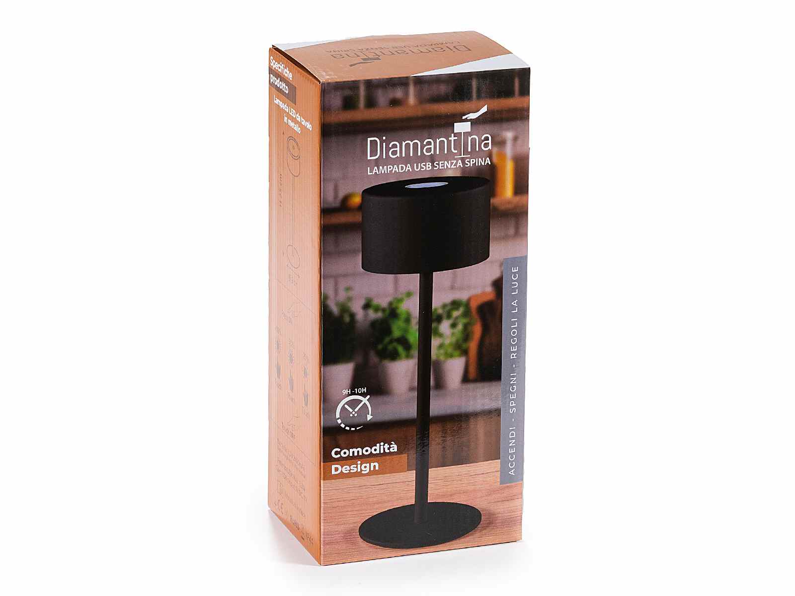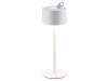 White metal table lamp with LED light, touch-activated and recharged with the included USB cable. It offers 9-10 hours of battery life. It features 3 intensity levels adjustable with a touch. Warm white light, ideal for indoor or outdoor use.