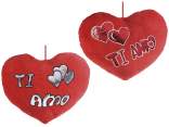 Red and pink heart-shaped cushions embroidered with the white "Love" lettering and small shiny hearts for Valentine's Day