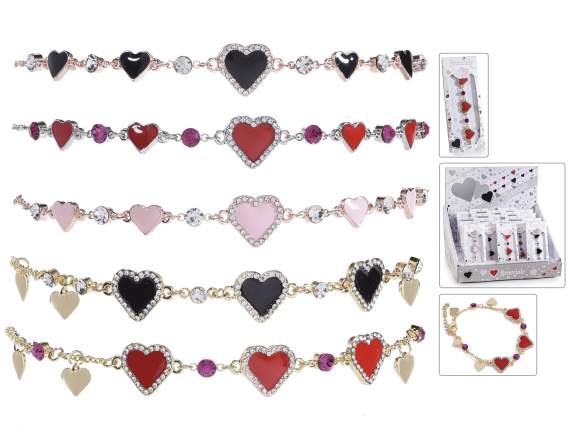 Valentine's Day bracelets with lacquered hearts and rhinestones, with a card in a 20-piece display.