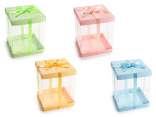 Clear, colorful PVC gift boxes with a stiff paper base and lid, embellished with a satin bow. Ideal for wrapping sweets, chocolates, party favors, and gifts. Perfect for bakeries, events, and gift shops.