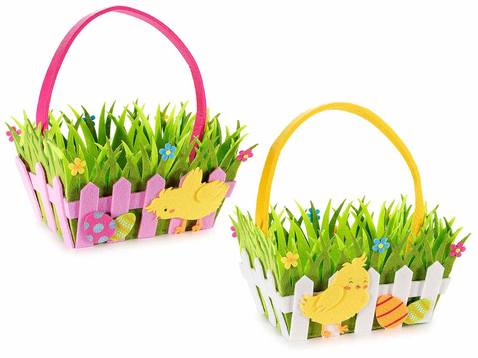Easter baskets made of picket fence cloth with chick, grass and eggs