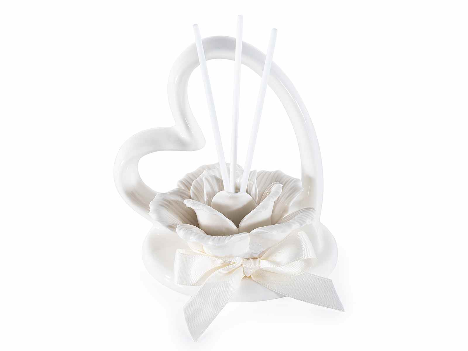 Porcelain rose and heart-shaped fragrance diffuser with wooden stick and antique white satin bow