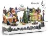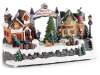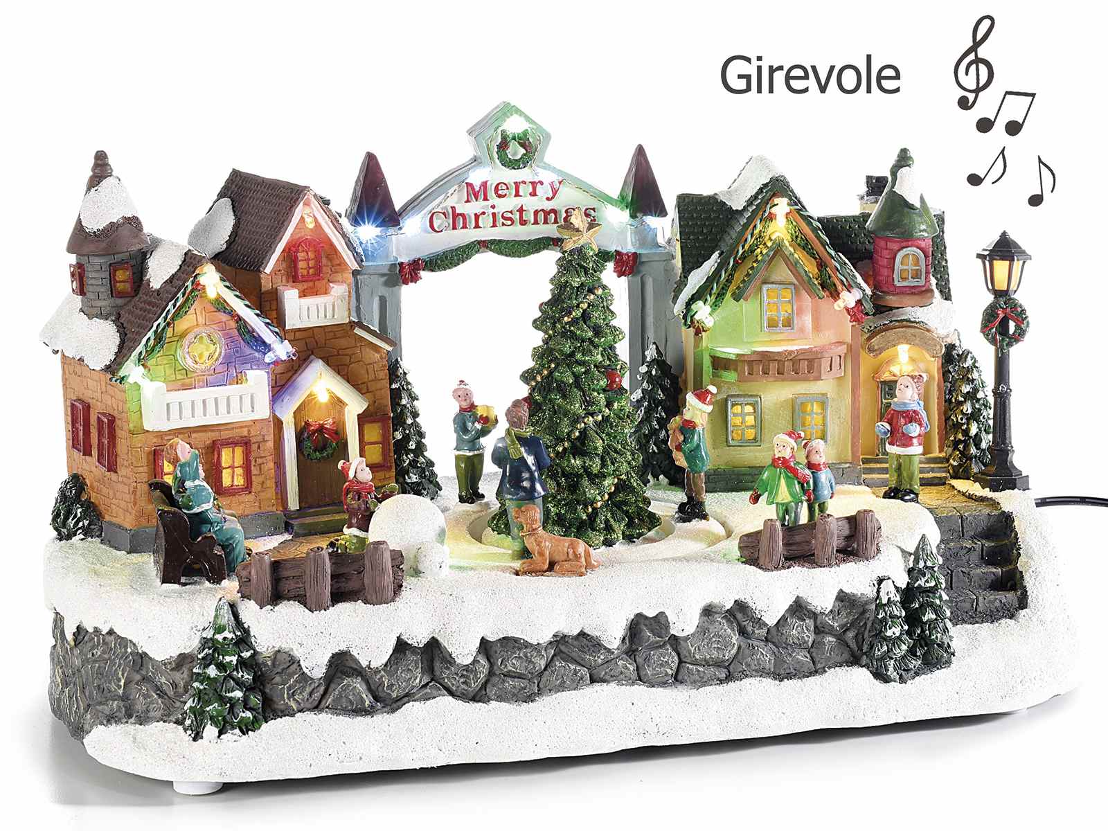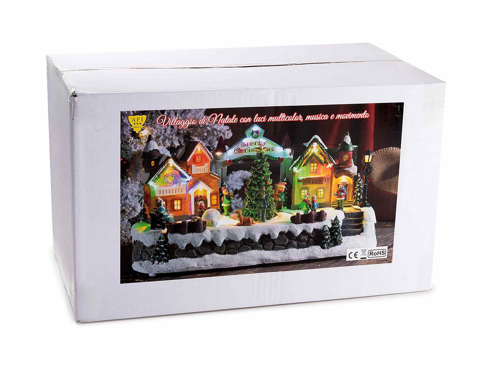 Resin Christmas village with rotating tree, multicolor LED lights and music. Detailed scene with illuminated houses, festive characters and Christmas tree.