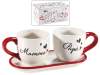 Coffee cups with the words "Mom" and "Dad" in a set of two on a ceramic saucer, in a gift box