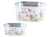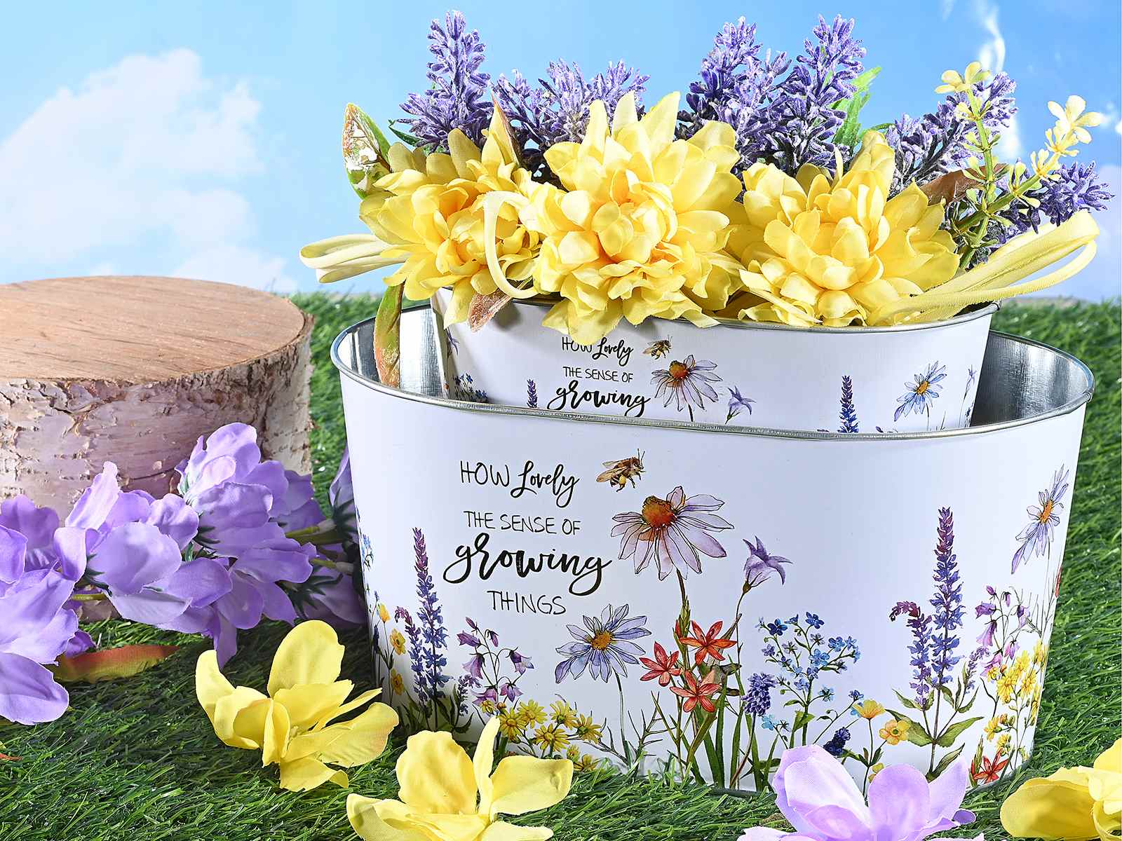 Oval metal vases decorated with colorful flowers in a set of two pieces