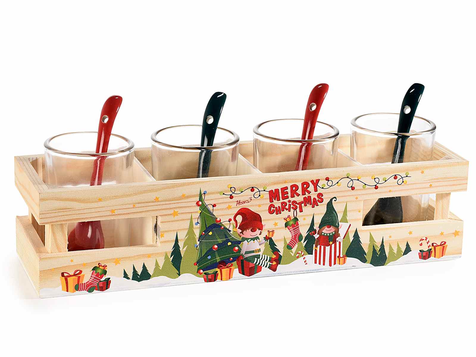 Christmas aperitif set with 4 glass glasses and ceramic spoon on decorated wooden base