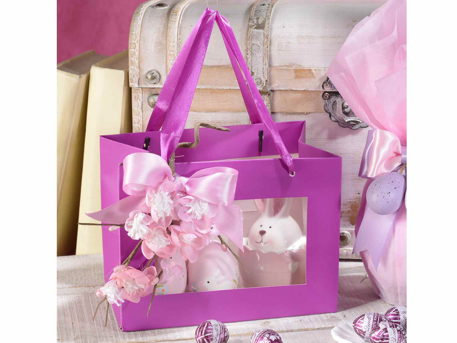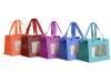 Bags / shopping bags with transparent window and fabric handles in colored paper