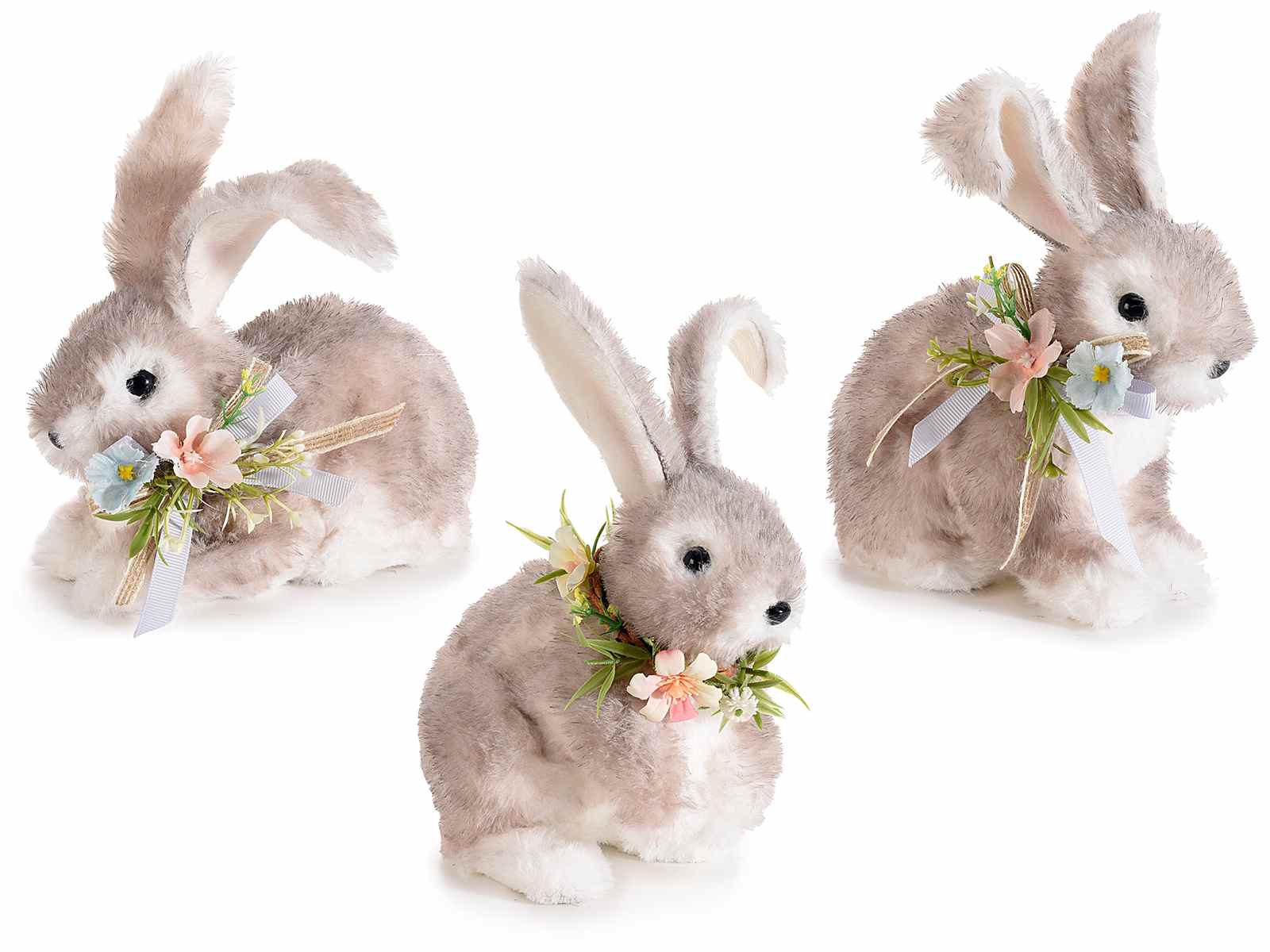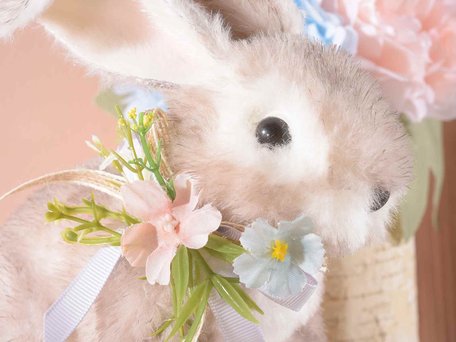 Decorative Easter bunnies in soft artificial fur to place with a necklace of artificial flowers