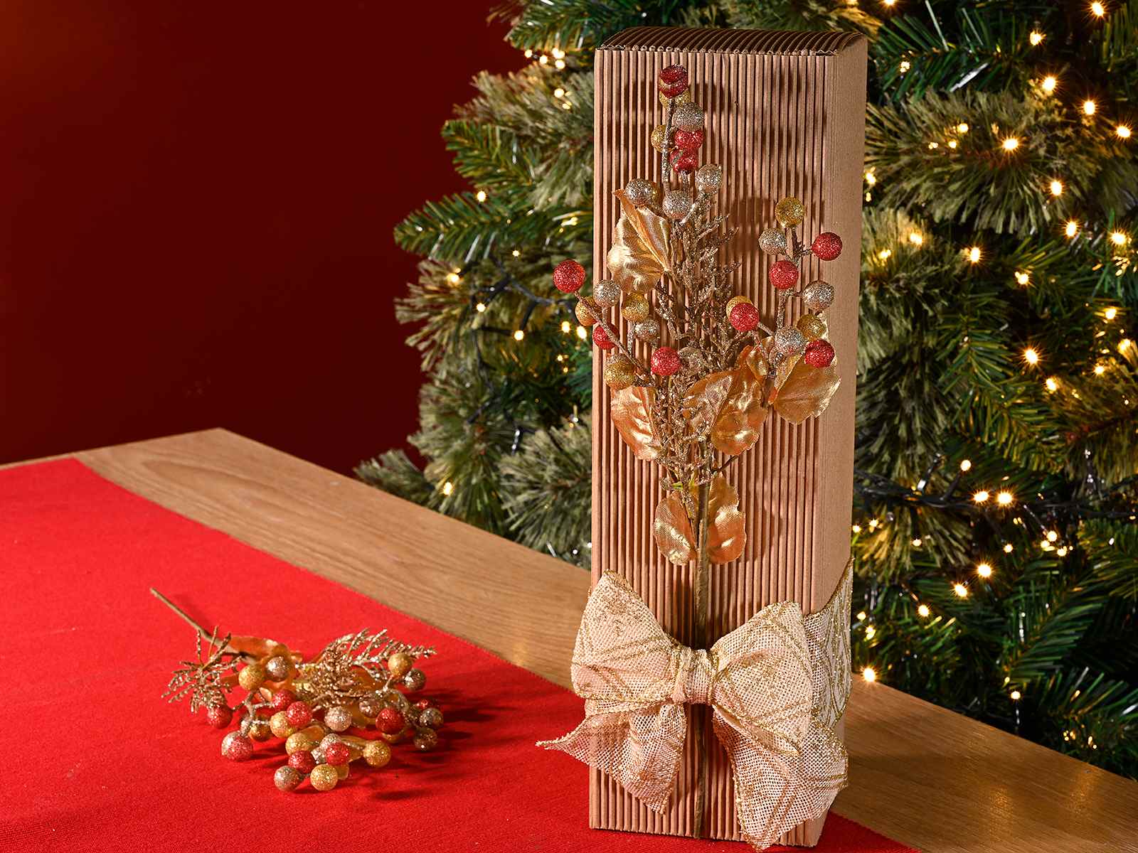 Sprig of red and gold glitter berries and golden leaves