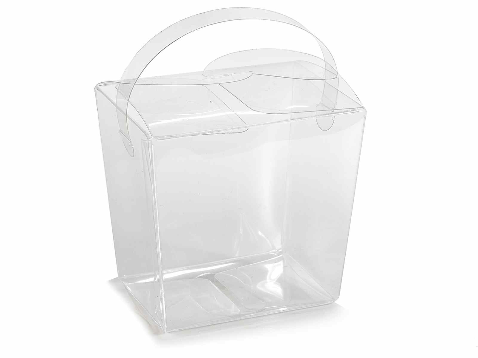 Choose the 75x56x85mm PVC box with handle if you need to create eye-catching gift packaging in just a few simple steps, or if you want something simple for ceremonies and special gifts. Thanks to its ability to come into direct contact with food, it will also be easy to use for wrapping biscuits, chocolates, and sweets. Take advantage of its elegant shape and discover our other PVC boxes for wholesale .