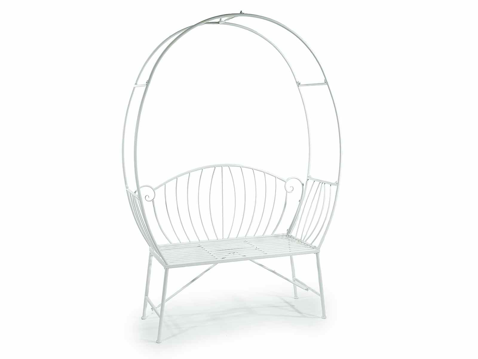 White metal bench with arch and decorated backrest